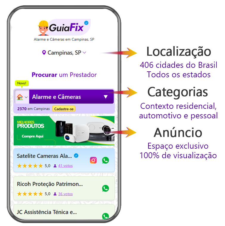 A segmentação detalhada dos espaços publicitários no GuiaFix gera alta taxa de interesse e relevância, maximizando a eficiência da sua campanha e reduzindo desperdício de exposição.
